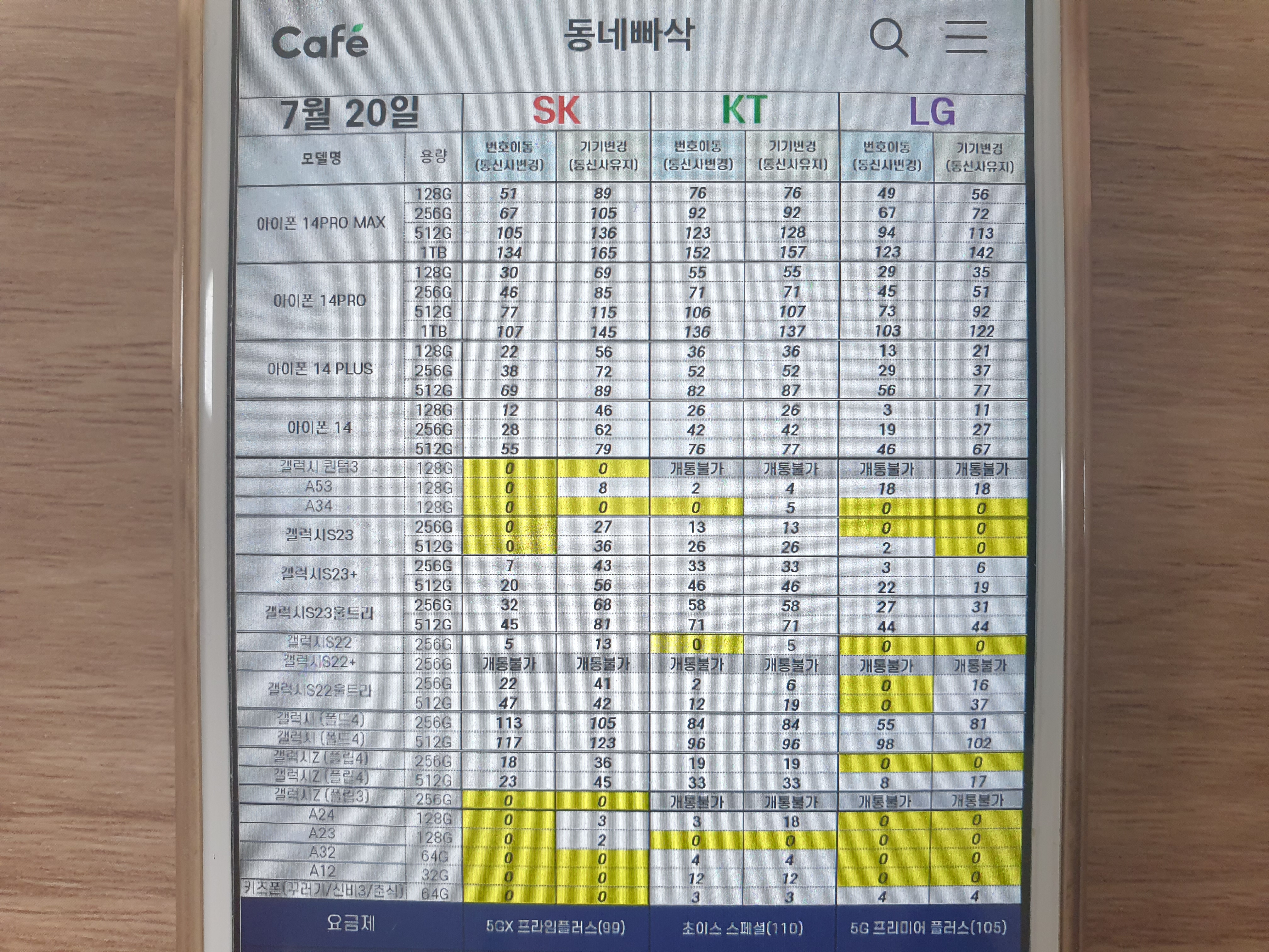 다음은 핸드폰 성지에서 제공하는 각 모델의 시세표입니다.