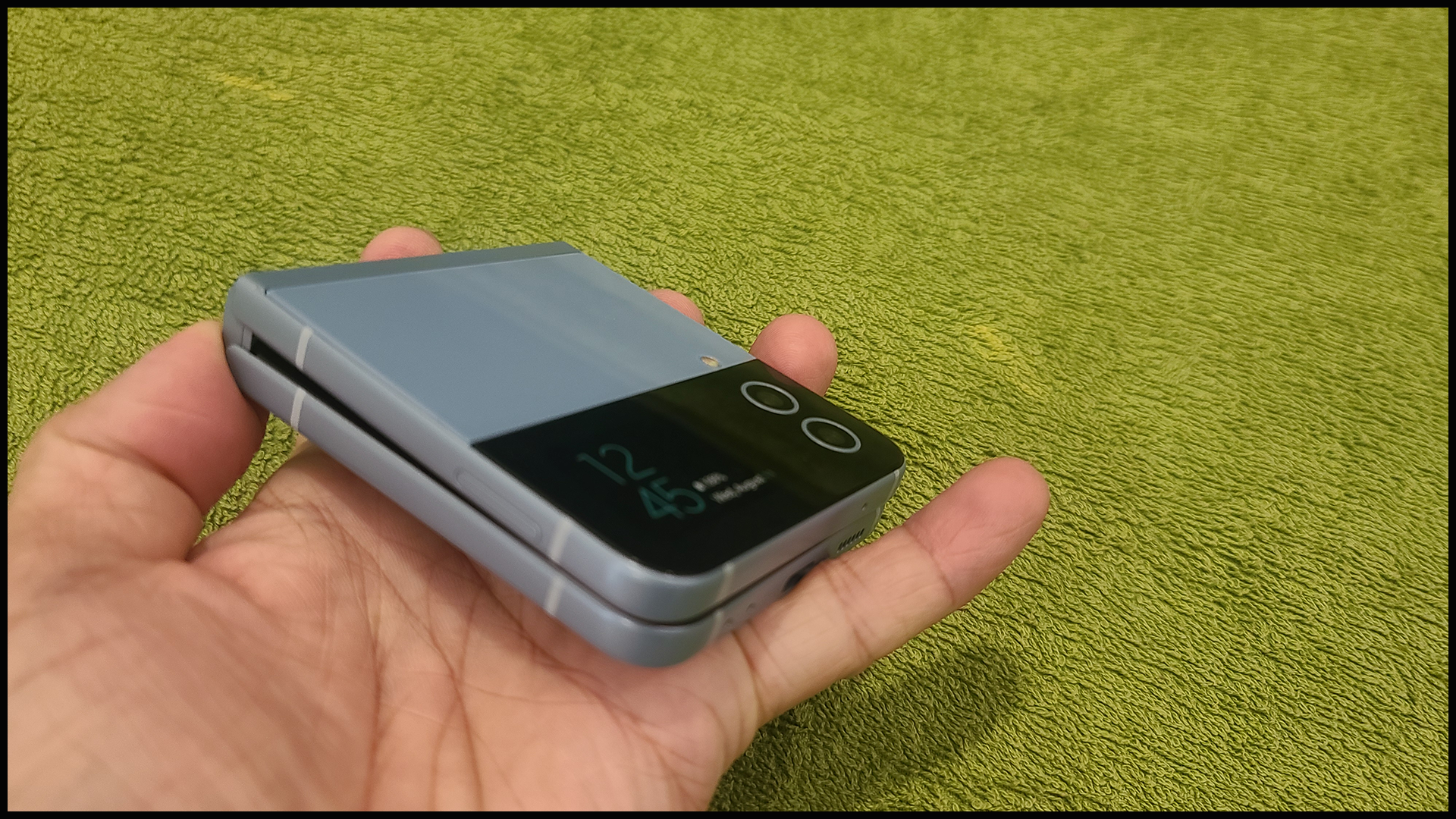갤럭시 Z 플립4의 블루 색상은 청바지나 운동복과 같은 캐주얼한 옷과 잘 어울리며,